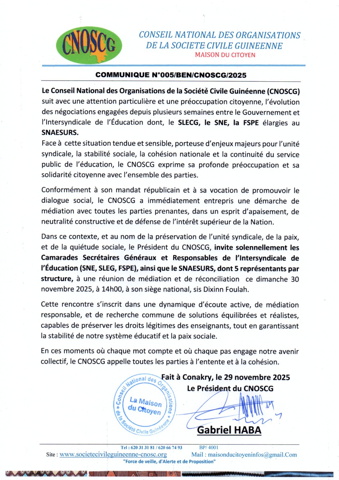 Guinée : le CNOSCG se dit profondément préoccupé par la crise persistante qui secoue le secteur de l’Éducation (Communiqué)
