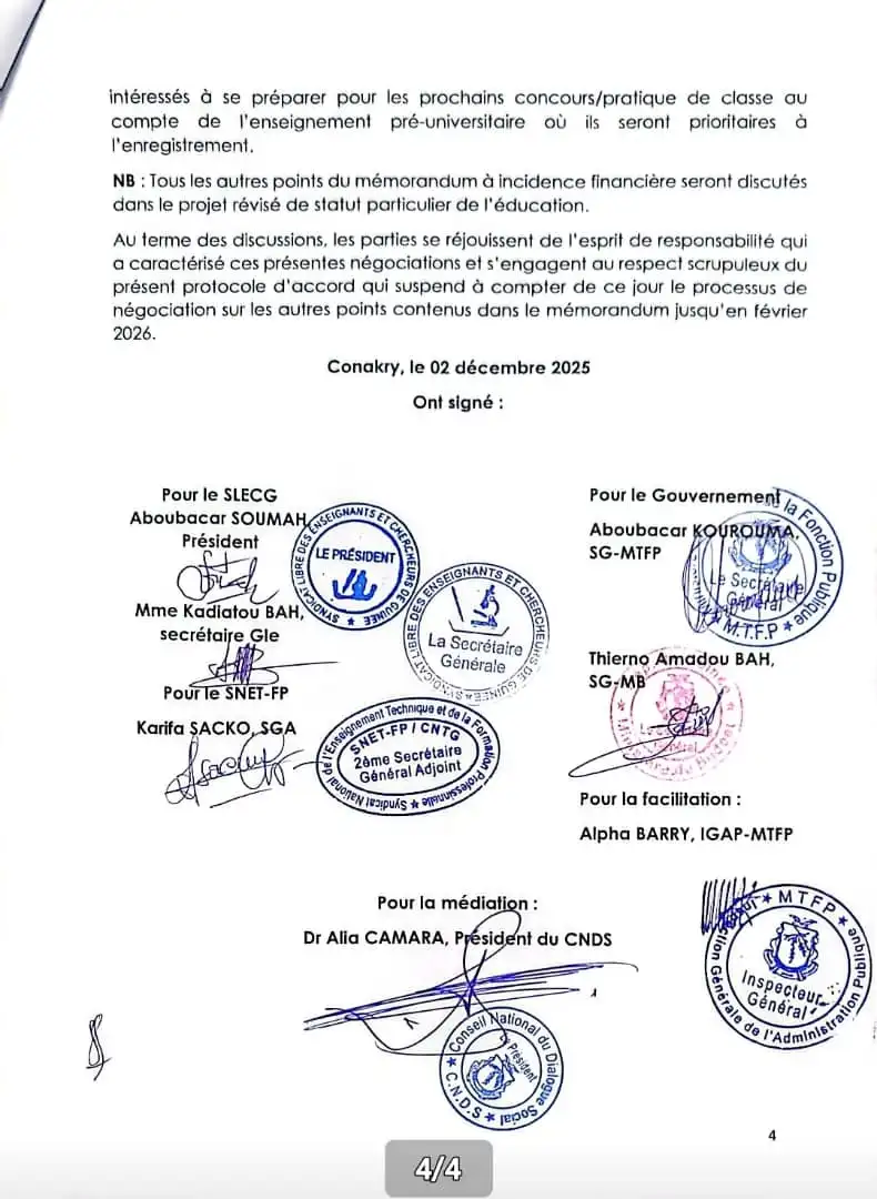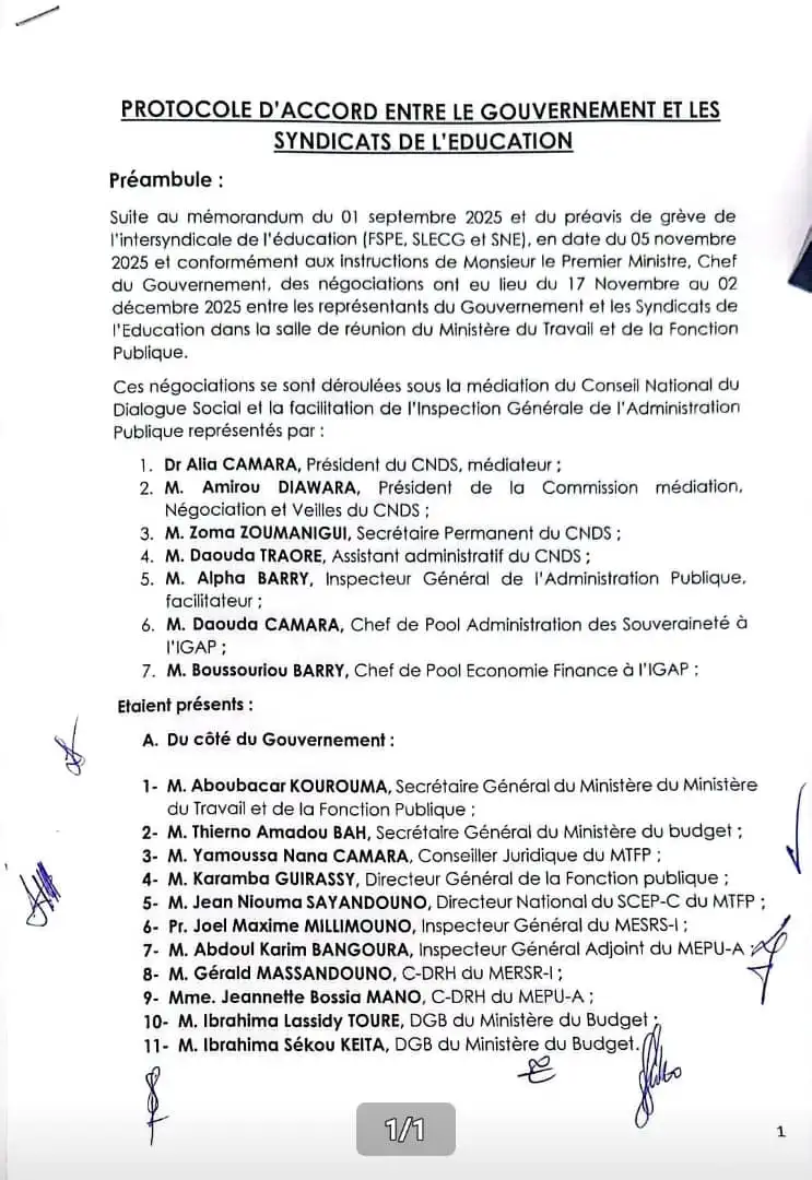 Le gouvernement guinéen et les syndicats de l’éducation ont signé, ce mardi 2 décembre 2025, un protocole d’accord marquant une avancée majeure dans la résolution des tensions nées du mémorandum du 1er septembre 2025 et du préavis de grève déposé le 5 novembre. Après plus de deux semaines de négociations tenues du 17 novembre au 2 décembre 2025 au Ministère du Travail et de la Fonction Publique, les deux parties sont finalement parvenues à un compromis sous la médiation du Conseil National du Dialogue Social (CNDS) et la facilitation de l’Inspection Générale de l’Administration Publique (IGAP).