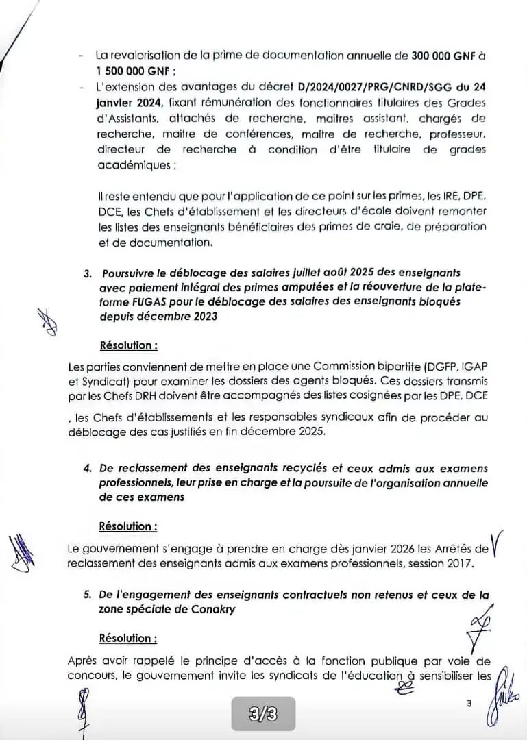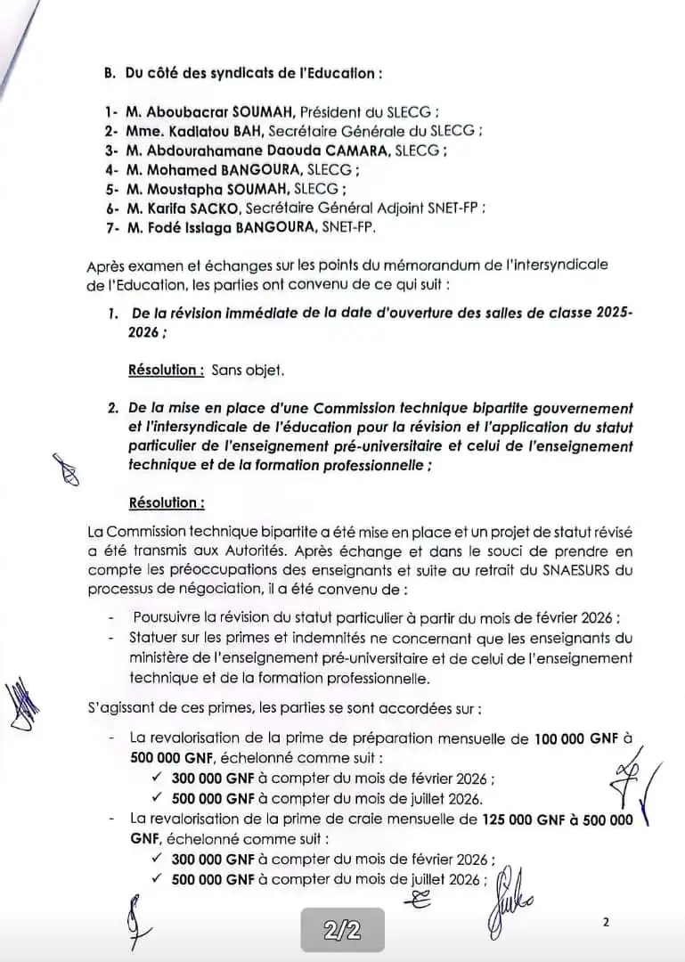 Cet accord, signé par les représentants de l’État et les responsables syndicaux dont Aboubacar Soumah (SLECG), Karifa Sacko (SNET-FP) et les cadres du Ministère du Travail et du Budget, marque une étape importante pour la stabilité du secteur éducatif en Guinée.