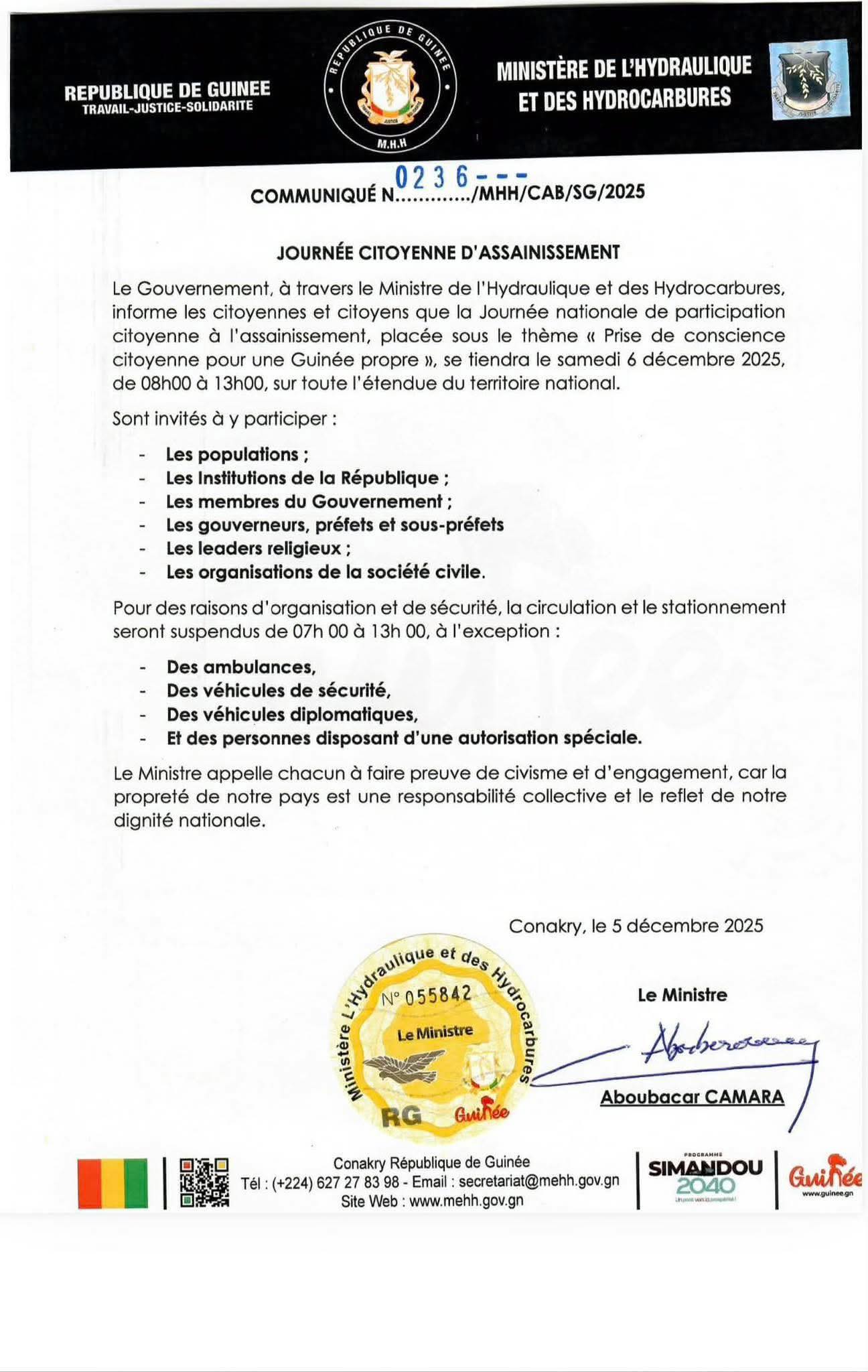 Le ministère de l’Hydraulique et des Hydrocarbures a annoncé, ce vendredi 5 décembre 2025 à travers un communiqué, la tenue d’une journée nationale d’assainissement demain samedi 6 décembre 2025, de 08h00 à 13h00, sur toute l’étendue du territoire national. L’initiative, placée sous le thème « Prise de conscience citoyenne pour une Guinée propre », vise à mobiliser la population autour de l’hygiène publique et du civisme.