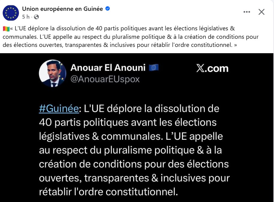 Dans un post sur X repris sur la page Facebook de la délégation de l’Union européenne en Guinée, le porte-parole des Affaires étrangères Anouar El Anouni fustige la dissolution par le gouvernement guinéen de quarante (40) formations politiques. Ci-dessous la capture de ladite publication.