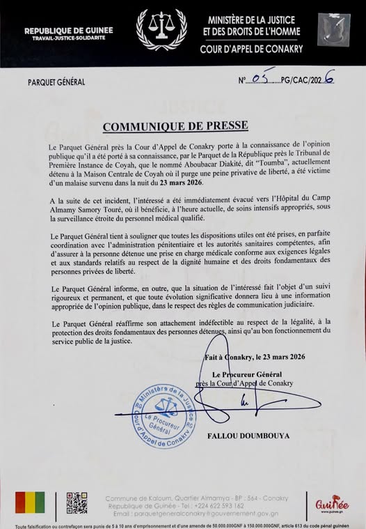 Disparition inquiétante de Toumba Diakité : une nouvelle zone d’ombre sur le système carcéral guinéen 23 mars 2026