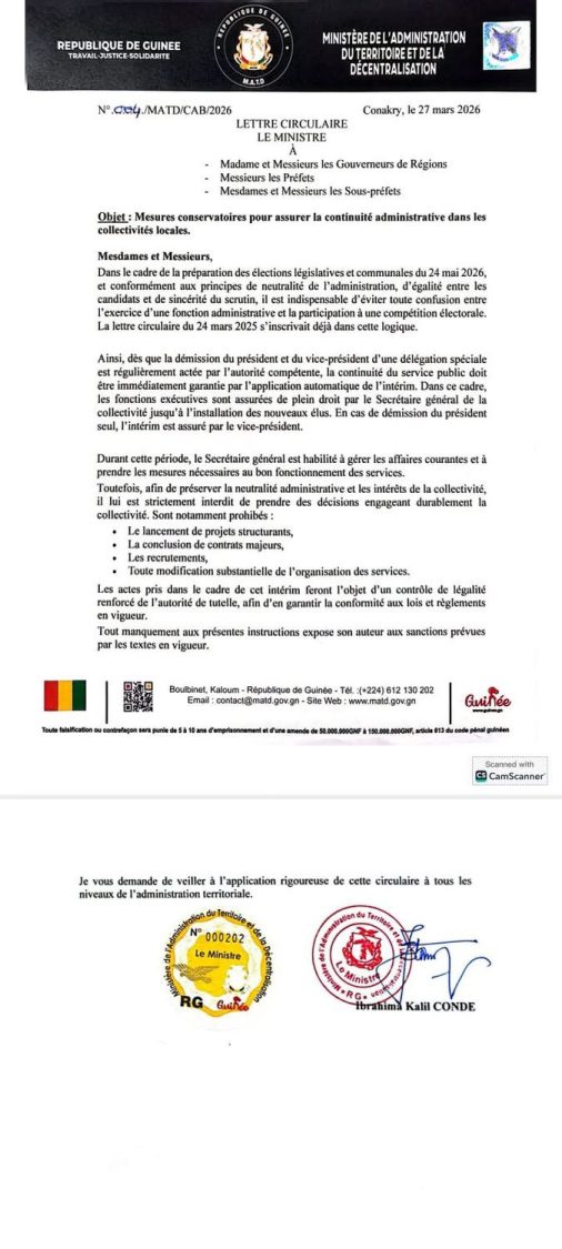 Conakry, 28 mars 2026 – À l’approche des élections législatives et communales du 24 mai 2026, le ministère de l’Administration du Territoire et de la Décentralisation (MATD) publie un communiqué précisant des mesures conservatoires pour garantir la continuité administrative tout en préservant la neutralité de l’administration publique.
