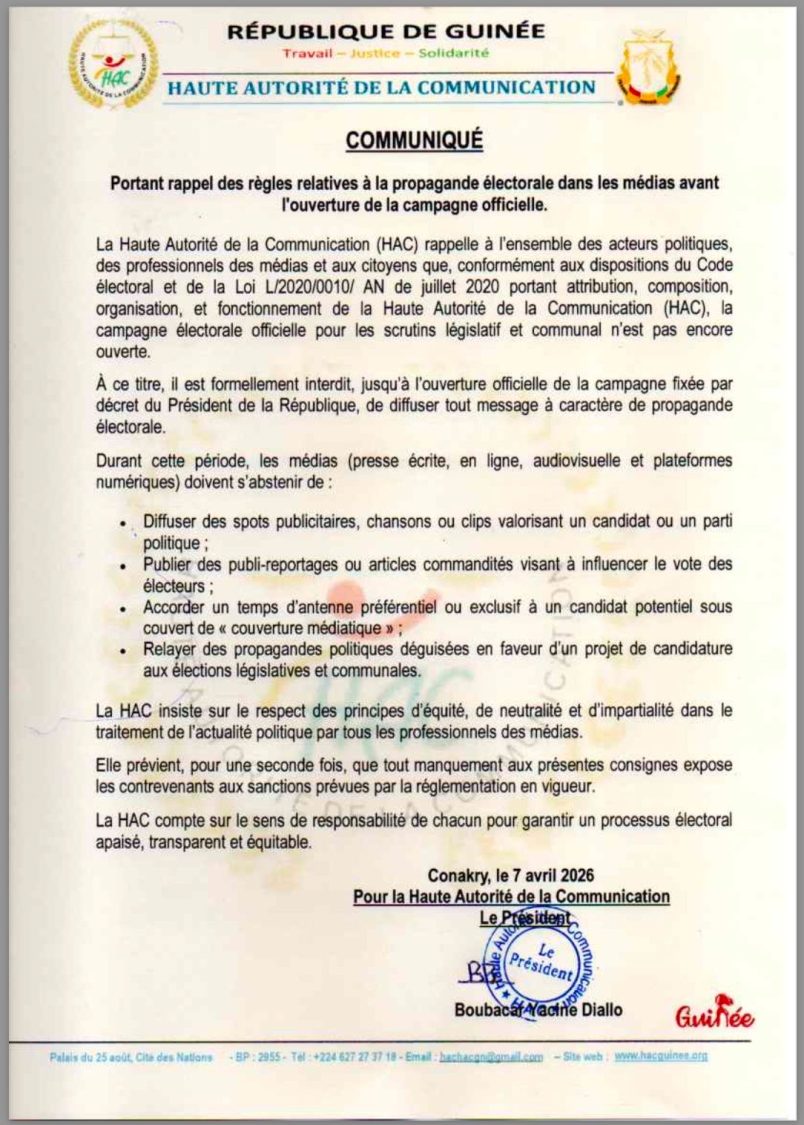 Dans un communiqué publié ce mardi 07 avril 2026, la Haute Autorité de la Communication (HAC) rappelle à l’ensemble des acteurs politiques, des professionnels des médias et aux citoyens que la campagne électorale officielle pour les scrutins législatif et communal n’est pas encore ouverte. Par conséquent, il interdit formellement à toute communication liée à la campagne, jusqu’à l’ouverture officielle de la campagne fixée par décret du Président de la République.