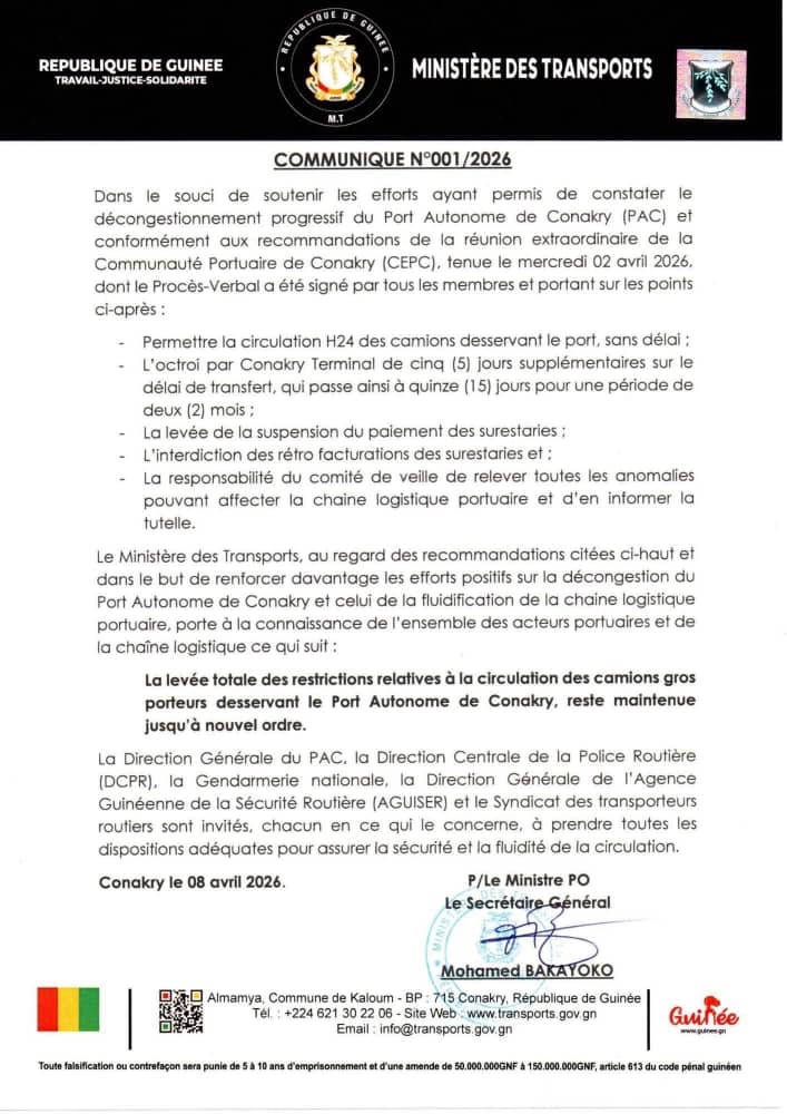 Dans un communiqué rendu public ce jeudi 09 avril 2026, le Ministère des Transports annonce la levée totale et définitive des restrictions sur la circulation des camions gros porteurs. Dans un effort continu pour décongestionner le Port Autonome de Conakry (PAC) et optimiser la chaîne logistique portuaire. Cette mesure, effective jusqu’à nouvel ordre, s’appuie sur les recommandations issues de la réunion extraordinaire de la Communauté Économique Portuaire de Conakry (CEPC), tenue le mercredi 2 avril 2026.