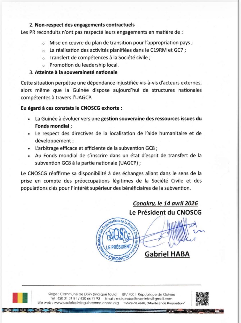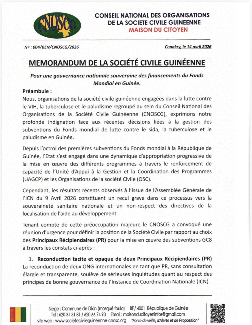 Dans un mémorandum rendu public ce mardi, 14 avril 2026, le conseil national des organisations de la civile guinéenne (CNOSCG) exprime son indignation face à l’utilisation des fonds dédiés pour lutter efficacement contre les maladies: VIH, Tuberculose et le Paludisme.