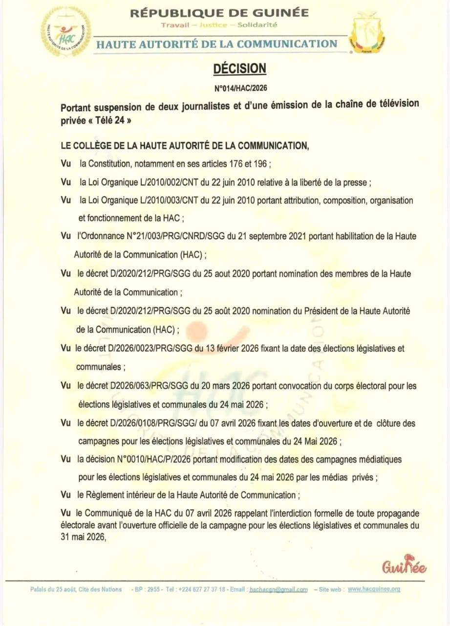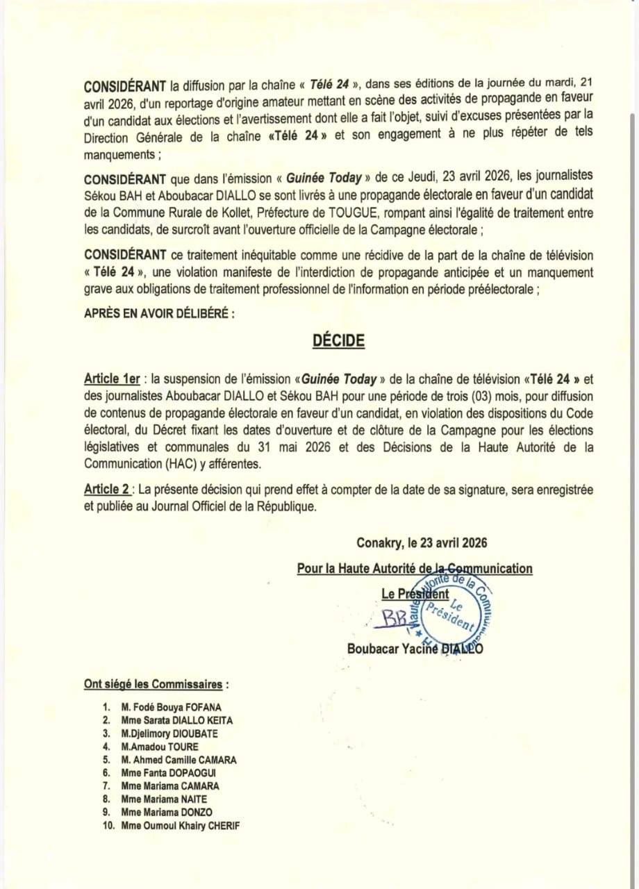 A travers une décision datant de ce jeudi, 23 avril 2026, la Haute Autorité de la Communication (HAC) suspend les journalistes Aboubacar Diallo et Sékou Bah pour une durée de trois mois. Autre chose, l’émission « Guinée Today » subit le même sort.