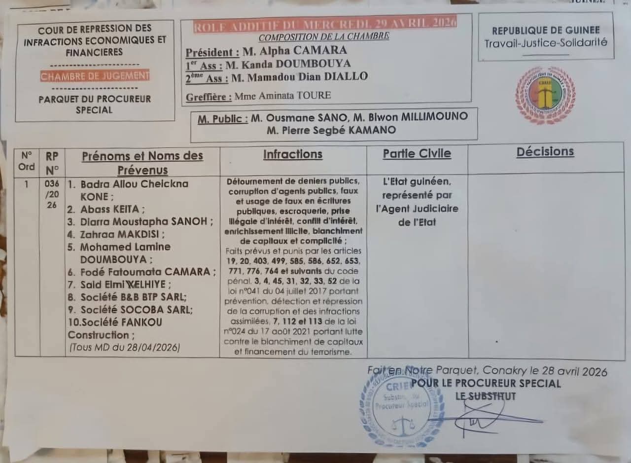 Selon le document officiel du parquet spécial consulté, cette audience se déroule devant la Chambre de jugement présidée par le magistrat Alpha Camara, assisté de Kanda Doumbouya et Mamadou Dian Diallo. Le ministère public est représenté par les substituts Ousmane Sanou, Biwan Millimouno et Pierre Segbé Kamano, conformément à la nouvelle configuration de la juridiction spécialisée récemment mise en place.