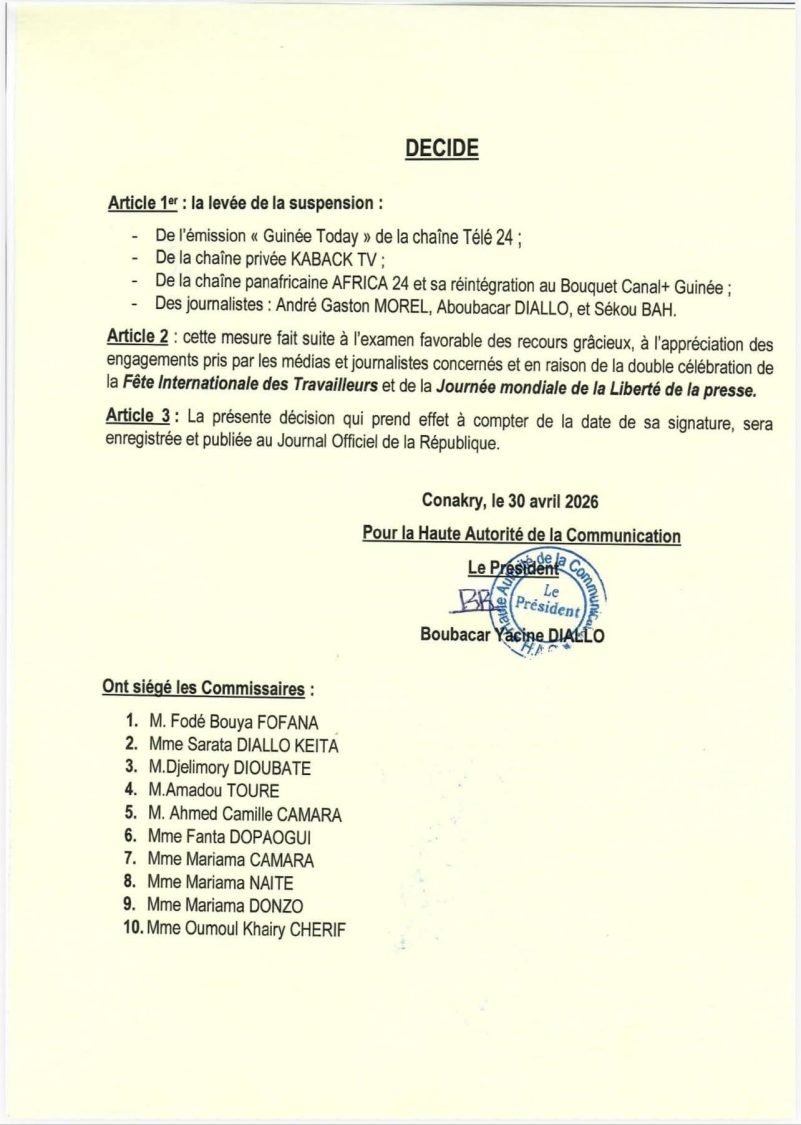 Sont concernés l’émission Guinée Today de Télé 24, la chaîne privée KABACK TV, la télévision panafricaine AFRICA 24 réintégrée dans le bouquet Canal+ Guinée, ainsi que les journalistes André Gaston Morel, Aboubacar Diallo et Sékou Bah.