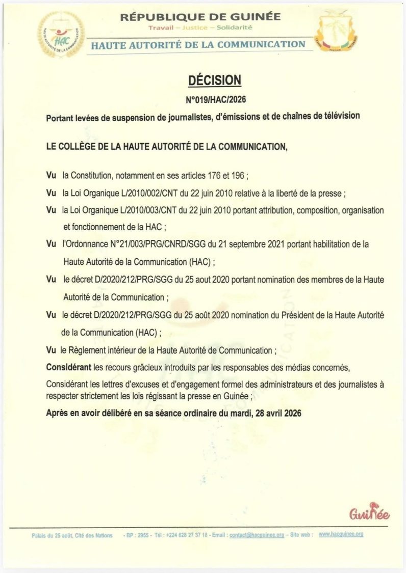 La Haute Autorité de la Communication (HAC) a levé ce jeudi plusieurs sanctions visant des médias et journalistes guinéens.